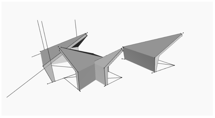This final design concept was tricky to create in Dynamo because Dynamo doesn’t have a tool for creating triangulated mesh on a plane. I tried with creating a Toposurface mesh but this only worked on a plane orientated in the Z direction. The eventual method I had to use was to create a Nurbs surface and project the triangles onto it.