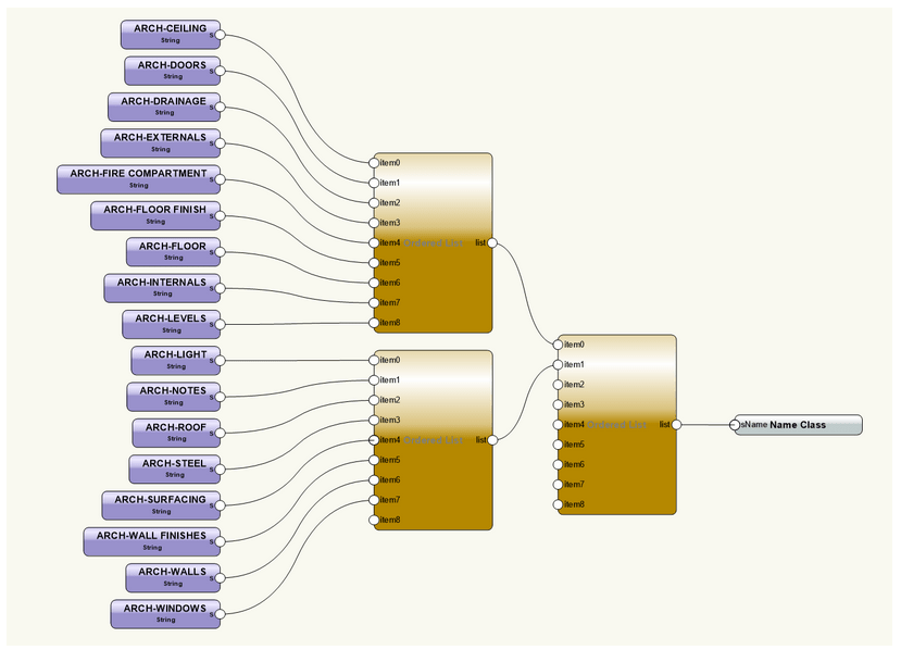 In this first script I only need a few nodes to automatically create a collection of new classes in the base document. The key node performing the action is the grey node on the right hand side.