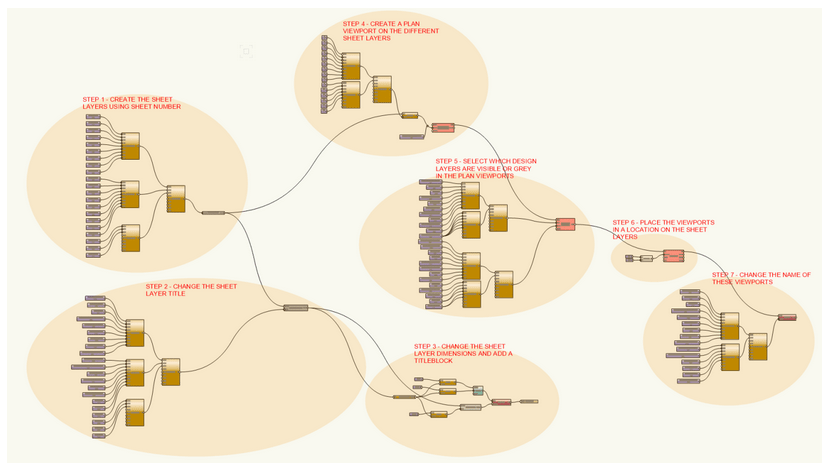 Finally, we can create a series of sheet layers and generate plan viewports to put on them. Below is the full script, it can be divided up into 7 different parts. Each of the seven parts of the script does a different job.