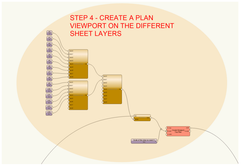 Step 4 – This step creates the Viewports, the key node is the red node ‘Create Viewport Top Plan’. It can only generate Top Plan Viewports. You need to feed it a design layer and a scale factor.