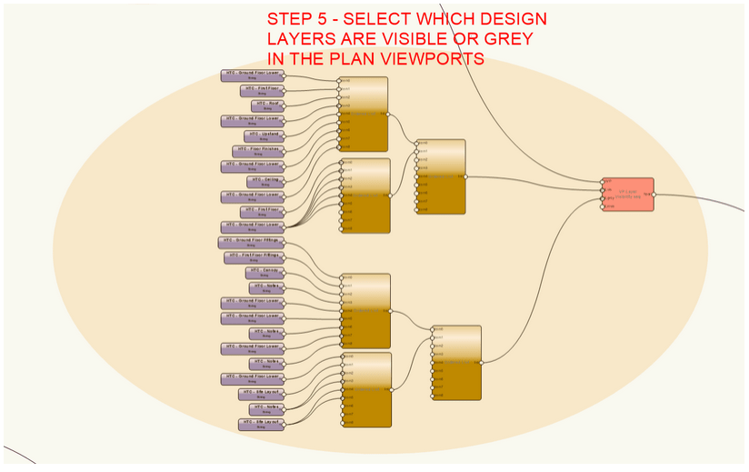 Step 5 – This step is setting up the Viewports, so the correct design layers are visible, and which are set to ‘grey’. The key node is the red node ‘VP Layer Visibility seq’.