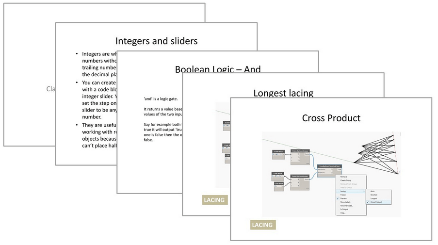 In the classes I used a mixture of building scripts together live and other parts were listen and learn. I created five separate PowerPoint files to introduce the key facets of using Dynamo.