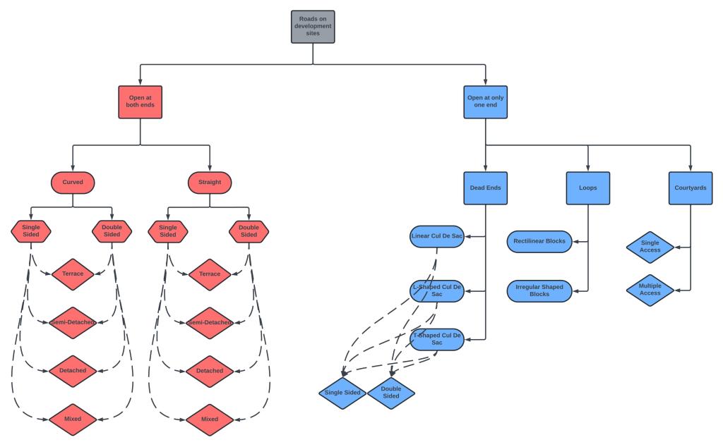 There are different types of roads found on residential development site plans. They are grouped by being open at both ends or closed at one. Open roads connect one side of a site to another. Closed roads are dead ends and there are three sub types; Cul De Sacs, loops and courtyards.