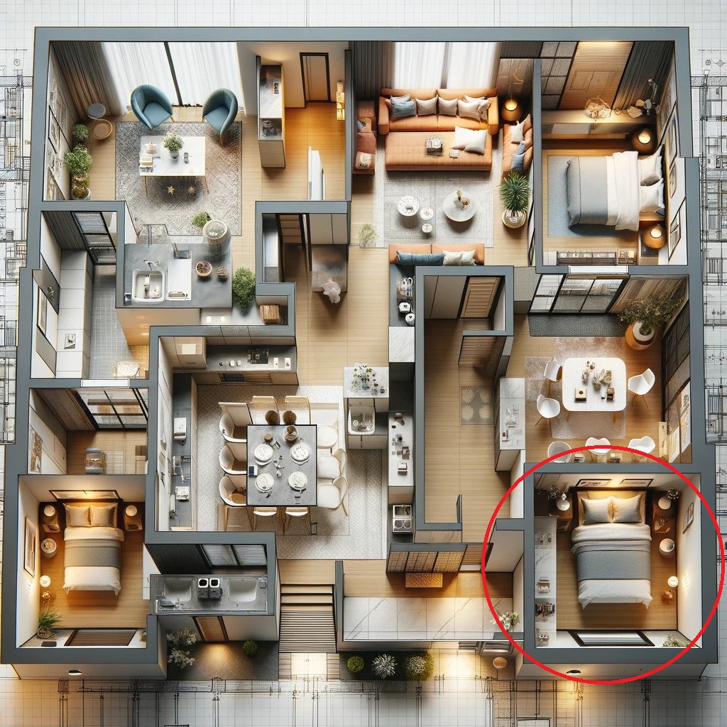 Below are some images created from text inputs. You will see there are mistakes in them. The bedroom in the red circle has no door into it.