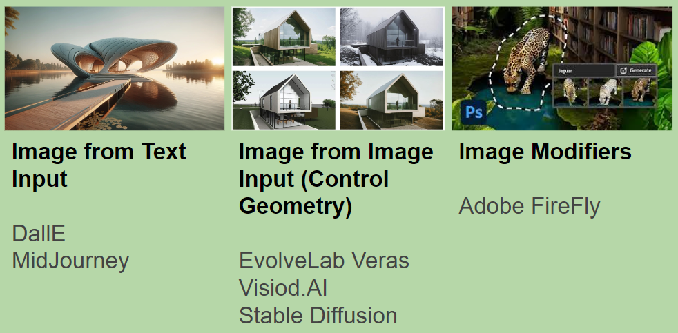 The three most common ways to us Gen AI to create Images are: 1. From text input (left) 2. From control image/geometry + text (middle) 3. Image modfiers which allow you to edit an image with AI (right).